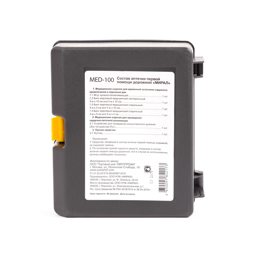 Аптечка предназначена для оказания первой помощи пострадавшим в ДТП с целью устранения угрожающих жизни нарушений в пределах компетенции водителей транспортных средств. Также аптечка может применяться для оказания первой помощи при травмах не связанных с эксплуатацией автомобиля.